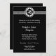 Convites de 25 anos de casamento elegantes preto e prata. O convite tem um emblema prateado de 25 e o fundo preto faz com que as letras prateadas se destaquem. Adicione os detalhes da sua festa.