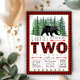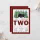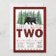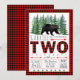 Convites de aniversário de dois anos de meninos lenhadores com urso rústico e árvores de abeto em um fundo xadrez de búfalo lenhador. Este convite de aniversário de 2 anos de lenhador com urso xadrez de búfalo vermelho e preto é facilmente personalizado para o seu evento, basta adicionar os detalhes do seu evento.