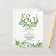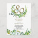 Este convite de aniversário elegantemente belo com folhas verdes e folhagens e branco com um toque de flores azuis é perfeito para uma celebração de 80 anos de aniversário para mãe ou pai, avós, colega ou outros. Basta editar o texto para atender às suas necessidades exatas. Possui fontes modernas manuscritas e de caligrafia em dourado e preto.