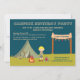 Este convite para festas de aniversário de meninos 5 horas por dia, 7 dias por semana tem um tema de acampamento. Ele apresenta um rapaz loiro ao lado de uma fogueira com seu saco-cama aos seus pés. Ao fundo, há uma tenda verde com uma lanterna, um cachorro-quente sobre um pau, e um marshmallow sobre um pau na frente. À direita, há uma faixa com o nome do aniversariante que você pode personalizar facilmente. No topo e à esquerda, você pode personalizar todas as informações de festa de aniversário. © 2012 Jessica Weible/JW Ilustrações