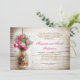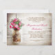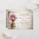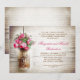 Convites de festa de aniversário de casamento ou jantar de aniversário de casamento com jarra de pedreiro e fundo de madeira rústica romântica e flores rosa escuro. Sugiro um papel lino de textura linda para este design.