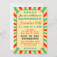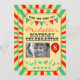 Convites de aniversário personalizados do Circo de Fotos — troquem a foto da demonstração para uma foto de sua escolha. Cada convite de circo também permite que você mude o número no balão para a idade do seu filho para o seu aniversário. Os convites para circo são decorados com listras, estrelas e pennants em azul aqua e vermelhos. Girafas, leões, macacos, rinocerontes e elefantes também são adicionados para adição de decoração.