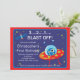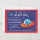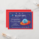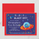 Comece a festa de aniversário de criança com nosso belo convite de aniversário no espaço externo apresentando uma explosão de foguete com planetas colocados em um fundo azul-céu com estrelas com fundo de quadros vermelhos. Fofo para a festa de aniversário de meninos do espaço. Visite nosso compro para ver outros convites de aniversário de navios no espaço externo e correspondência de notas de agradecimento, adesivos e selos postais. © Designs Blackleaf