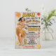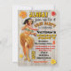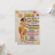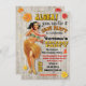 Super divertido Luau Birthdayparty havaiano Luau com uma garota vintage hula e flores hibiscus contra um fundo de madeira curtida. As costas apresentam um ukulele de madeira.