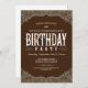 Estes convites de aniversário são marrons escuros com um design azul claro e bege. Personalize o texto para ajustado qualquer idade.