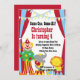 Comece a festa de aniversário de circo dos seus filhos com nosso brilhante convite de aniversário de palhaço, ousado e bonito, apresentando o palhaço mais bonito com um elefante e um leão em uma tenda de circo vermelho e azul com banners festivos e uma festa de aniversário de estrela para agirinhas ou festas de aniversário de garotos. Visite nosso compro para ver outros convites de aniversário de temas circo e correspondendo a notas de agradecimento, adesivos e selos postais. © designs Babystar