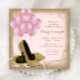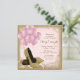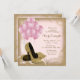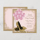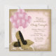 Convites de festa de aniversário rosa e dourado para mulher com sapatos de salto alto com lantejoulas douradas, balões cor-de-rosa, champanhe e pérolas em um fundo com redemoinho rosa e dourado. Este convite de festa de aniversário rosa e dourado é facilmente personalizado para o seu evento, basta adicionar os seus detalhes no estilo de letra e cor, texto e layout de sua escolha. Você também pode mover ou excluir o champanhe e os balões. Este é um design impresso sem jóias reais, pérolas, lantejoulas, etc.