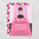 Chamando todos os modelos! Venha ficar glamourosa com a aniversariante e ande pela pista em estilo diva! Você terá muitas fotografias bonitas para lembrar da ocasião especial com este tema de festa de aniversário amigável da foto! O convite tem uma pista cor-de-rosa onde uma menina bonito está em uma blusa rosa e saia preta com um arco de fita branco e um estilo elaborado de seu cabelo. O holofote está sobre ela enquanto se prepara para fazer a caminhada. O contrário é um padrão feito com arco branco e azul. Personalize facilmente com os detalhes da sua festa no espaço da pista.