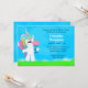 Convite de aniversário do garoto com um Unicórnio bonito segurando sorvete e colher e vestindo um chapéu de festa. O fundo é grama verde e céu azul. Personalize com os detalhes do seu partido. gráficos ©KristiW