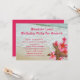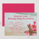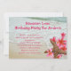 Convites de aniversário adulto com tema Luau e design de praia e flores. O texto em rosa brilhante combina com as lindas flores tropicais de frangipani, ou plumeria. Elas decoram o canto inferior e estão enroladas em torno de uma estrela-do-mar. Água do oceano chegando à praia é a imagem de fundo. Use dois modelos de texto para personalizar para o seu evento. A redação de exemplo é para uma festa surpresa. Compre também como download instantâneo para compartilhar online.
