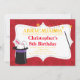 Comece sua festa de mágica com nosso convite de aniversário mágico de espetáculos de mágica apresentando um quadro vermelho úmido com estrelas de ouro e um chapéu preto com coelho. Totalmente personalizável por você com suas informações. ©Corazón Dulce
