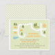 Um convite de aniversário de acampamento projetado para parecer um mapa do local de acampamento. O mapa inclui ícones de pinheiros, bússola, um lago e ícones de tendas de acampamento. No verso, há listras verdes e brancas. Personalize facilmente com os detalhes do seu acampamento no espaço fornecido.
