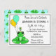 Convites de aniversário com uma rã fofa sentada em um nenúfar com um chapéu de aniversário e balões. Fofo para a festa de aniversário de um menino.