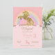 Estes convites unicórnios são cor-de-rosa com um unicórnio ouro e arco-íris neles. Há dois unicórnios brancos e um unicórnio rosa nele. Dizem: "Um dia mágico está a caminho!" Você pode usar esses convites para chás de fraldas mudando "está virando" para "chá de fraldas" e deixando o vazio etário.