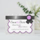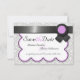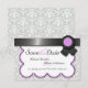 Lindos convites de salvar a data de casamento com um padrão damasco cinza e branco e um design de fita preta com roxo no topo.