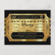 Bilhete elegante e vintage, pronto para você adicionar seus detalhes pessoais. Bilhete dourado com fundo preto, relógio antigo, presente, máscara de mascarada e gráficos de estrelas e tipografia que lembram o estilo dos anos 1920. Adicione seus próprios detalhes em caligrafia. Anuncie sua festa de Ano Novo com este convite divertido de evento com ingressos!