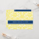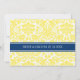 Cartões de convite de casamento em elegante e contemporâneo amarelo-limão brilhante, azul-marinho escuro e padrão clássico e chic floral damask vintage. Personalize esses convites com seus detalhes de casamento. Disponível em produtos correspondentes para todas as suas necessidades de casamento.