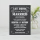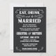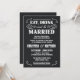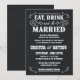 Convites de casamento estilo poster vintage western de lona preta - Coma, Beba e Case - Esboços rústicos ondulados e curvados e tipografia estilo velho oeste fora de moda em fundo de lona preta tingida naturalmente. Adicione os nomes dos noivos e as informações do casamento neste modelo fácil de usar. Elegante, mas divertido e romântico, letras estilo poster de salão retrô podem ser modificadas para o tema de casamento formal ou semi-formal. O estilo moderno casual é perfeito para casamentos contemporâneos chiques e modernos com um toque divertido do charme de cowboy do sudoeste para casais tradicionais. Entre em contato conosco para obter ajuda com a personalização se precisar de espaço adicional para os detalhes do seu casamento. Outros tamanhos e estilos disponíveis, juntamente com selos coordenados, acessórios de noiva, lembrancinhas de chá de panela e itens essenciais para kit de casamento para noivas DIY dentro do orçamento