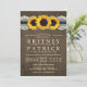 Invites de Casamento de Girassol e Rustic Blue Burlap - apresenta um fundo de madeira de celeiro com girassóis, rendas, burlap e uma fita azul impressa de marinho. Veja a coleção inteira correspondente nesta página.