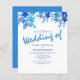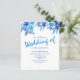 Convide seus convidados para comemorar seu dia de casamento, com estes elegantes convites de casamento floral azul. Apresentando um fundo branco clássico, um conjunto de flores cor-de-rosa e um modelo de casamento na moda que é fácil de personalizar.