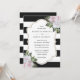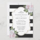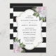 Convide seus convidados para sua elegante festa de casamento branca e preta com estes convites de casamento florais cor-de-rosa com flores cor-de-rosa e verde sobre fundo listrado preto e branco.