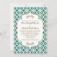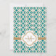 Convites de casamento elegantes e bonitos inspirados em azulejos marroquinos franceses com um tom azul-esverdeado repetitivo e um desenho de treliça geométrica dourada e floreios florais dourados. Este convite de casamento sofisticado e luxuoso é perfeito para um casamento temático marroquino, Noites Árabes ou Aladim. O verso destes convites personalizados e luxuosos com moldura e anúncios de aparência exótica e bonita podem ser personalizados com o monograma e os nomes da noiva e do noivo que logo se casarão na forma de quatro folhas. Arte e design © Chrissy H. Studios, LLC. Todos os Direitos Reservados.