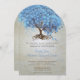 Whimsical Magical Tree of Love Powder Blue Leaf Tree on Tea Stainha Warm Silver Toned Metallic Paper e alguns designs giros e giros para melhorar as raízes do amor neste convite único para o casamento da floresta ou tema do casamento de bran.