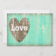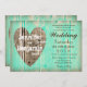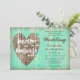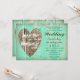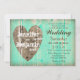Convites de casamento country rústico em madeira aqua verde com um recorte em forma de coração para um convite de casamento country único. A parte de trás do anúncio de casamento também tem o design de coração e madeira de celeiro com a palavra "Amor" dentro do coração. Estes são ótimos anúncios de casamento para um casamento country rústico e para qualquer pessoa que use aqua nas cores do casamento. Modelo fácil de editar. 40% de desconto ao encomendar 100+ convites.