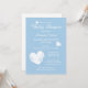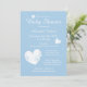 Convites de chá de bebê, azul e branco, elegantes. Convites de festa personalizada com pequenos corações brancos. design neutro adequado para rapaz e rapariga. Personalizar forma de recorte. Cor de fundo personalizada. ie aqua, amarela, azul ou rosa. Linda tipografia de na moda com símbolos de amor antigos. modelo personalizável com RSVP e linha de registro. Cartas bonitas para tomar banho de bebê para o seu príncipe ou princesa. design de papel para mulheres grávidas / mãe para ser.