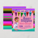 Convite de chá de bebê festa com uma adorável bebê vestindo um lindo vestido de Puebla em um fundo de serape multicolorido. Estes convites de chá de bebê da Festa das Meninas são facilmente personalizados para o seu evento, basta adicionar seus detalhes.