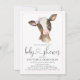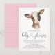 Convites de chá de bebê de vaca fofa com bezerro de vaca bebê em aquarela usando um laço rosa em um fundo de bolinhas rosa. Estes convites de chá de bebê de vaca adoráveis são facilmente personalizados para o seu evento, basta adicionar seus detalhes. Você também pode adicionar uma cor de fundo.