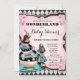 Convite de chá de bebê Alice no País das Maravilhas com xícaras de chá bonitas em um fundo de diamantes rosa e preto vintage. Este convite de chá de bebê Wonderland é facilmente personalizado para o seu evento, basta adicionar seus detalhes no estilo de fonte, cor e texto de sua escolha.