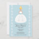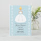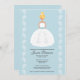 Personalize e personalize este chá de panela bonito com um fundo azul claro e uma bonito noiva loira em um vestido de noiva sem fio com uma faixa azul e um padrão bonito florescente na saia. Ela veste uma flor em seu cabelo e os acessórios com um adorável par de brincos perigosos em forma de gota de lágrima. Clique no link a seguir para ver todos os nossos Chrissy H. Ilustração © Chrissy H. Estúdios, LLC