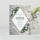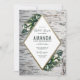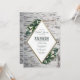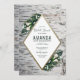 Convites de chá de panela de Birch Tree Woodland - apresenta um fundo de latido de árvore de pássaros rústicos com elementos florais de flores de solteiro de lírio, hálito de bebê, folhas e muito mais. A caixa de texto é um triângulo elegante com uma imagem falsa de ouro impresso em folha.