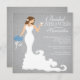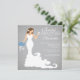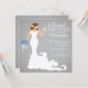 O convite para chá de casamento de noiva Na moda moderna apresenta uma noiva moderna chic brindando com um copo de vinho enquanto segura um belo buquê de flores para casamentos azuis escuras em um papel impresso em fundo de cinza com texto branco destacado. Nosso chá de panela moderno de noiva é perfeito para uma celebração popular de chás de panela de vinho. Visite nosso compro para ver este belo chá de panela em uma grande seleção de cores de buquê floral e diferentes variações de noiva.