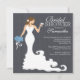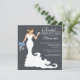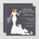 O convite para chá de casamento de noiva Na moda moderna apresenta uma noiva moderna chic brindando com um copo de vinho, enquanto segura um belo buquê de flores para casamentos azuis escuras em um papel impresso em fundo de linhagem preta, com texto branco destacado. Nosso chá de panela moderno de noiva é perfeito para uma celebração popular de chás de panela de vinho. Visite nosso compro para ver este belo chá de panela em uma grande seleção de cores de buquê floral e diferentes variações de noiva.