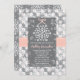 Um belo floco de neve tem chá de panela ou convite para chá de casamento com uma prata gelada, cinza e uma borda sutil branca, borda floral e floco de neve com um design impresso de fita colada rosa. Um floco de neve branco bonito atado por um delicado arco rosa claro pende do topo da carta com reflexos de neve em forma de coração atrás dela. A parte de trás do convite tem um coração repetitivo e um padrão de floco de neve. Trabalho de arte © Chrissy H. Estúdios, LLC. Todos os direitos reservados.