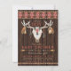 Convites de churrasco de bebê tribal masculino com caveira rústica e penas e flechas em um fundo de madeira rústica e design nativo americano. No verso, você pode escolher o seu fundo simplesmente movendo o fundo de madeira rústica uma camada para cima para cobrir o design nativo americano. Você pode personalizar facilmente este convite de churrasco de bebê tribal do sudoeste para o seu evento simplesmente adicionando seus detalhes.