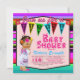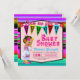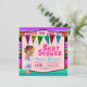 Convite de churrasco de bebê com uma linda bebê vestindo um colorido vestido de Puebla em um fundo festivo de serape multicolorido. Esses adoráveis convites de churrasco de bebê são facilmente personalizados para o seu evento, bastando adicionar seus detalhes.