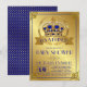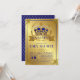 Convites de chá de bebê de príncipe azul real e dourado com bela coroa de pérola azul real e dourada em um elegante fundo azul real e dourado. Esses convites de chá de bebê de príncipe azul real e dourado são facilmente personalizados para o seu evento, bastando adicionar seus detalhes. Você também pode adicionar o texto de sua escolha ao banner.