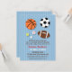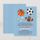 Um pequeno astro está a caminho! Celebre com a futura mamãe e convide suas amigas íntimas com este convite de chuvada de bebê com tema de esportes! Ele tem uma seleção de equipamentos de bola de esportes populares, como basquete, futebol americano, bola de futebol, beisebol, bola de tênis e uma bola de golfe. Um fundo azul com linhas verticais. Personalize dentro do texto de amostra disponível.