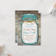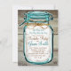 Convites de Despedida de Solteiro Rústicos Country em Jarro de Mason com uma bola de acento azul-teal em um jarro de conserva em um fundo de madeira de celeiro impresso. Adicione sua própria redação a este modelo personalizado.