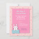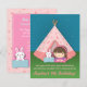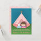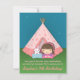 Planeje uma noite de acampamento no quintal para a aniversariante começando com este convite fofo para os convidados! O convite apresenta uma tenda teepee rosa em um gramado. A teepee tem ícones de estrelas e lua crescente. Uma menina vestida com uma blusa roxa e uma faixa de cabelo rosa está saindo da tenda. Um brinquedo de coelho branco está ao lado dela em uma almofada azul. Faíscas de estrelas brilham no fundo do céu. A paleta de cores predominantemente rosa torna isso ótimo para meninas aniversariantes. Personalize facilmente com os detalhes da festa.