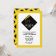 Convites criativos de festa de formatura amarelo, preto e dourado com a característica touca de graduação preta e dourada.