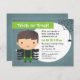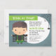 Convide os miúdos para uma sessão de truques ou de tratamento ao redor do Halloween com este convite azul! Tem um rapaz vestido de aranha com suspensórios verdes puxando suas calças com membros extras pendurados ao lado. Uma teia de aranha para decorações em seu cabelo. Enquanto outra aranha pende de uma teia ao lado do convite. Personalize facilmente dentro do espaço em branco oval no centro.