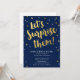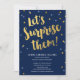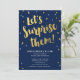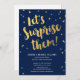 Convites de festa surpresa de casal com letras douradas e o título “Vamos Surpreendê-los”. O design apresenta confetes coloridos em dourado e rosa, e um fundo azul escuro. Personalize o texto na parte inferior para usar em um chá de bebê, aniversário de casamento, festa de noivado ou chá de casamento.