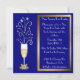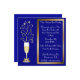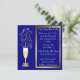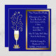 Convites de festas elegantes da véspera de ano novo do azul e do ouro. Gráficos de um vidro do champanhe, com um arco goldtone na haste e nos sparkles que disparam fora da parte superior do vidro, contra um fundo azul. Uma caixa de texto moldada goldtone no lado direito do convite tem o texto branco customizável. Personalize para dizer que qualquer coisa que você deseja. Grande convite de vista por uma noite memorável.