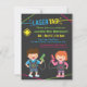 Planeje uma festa de aniversário cheia de diversão hospedando a festa em um centro de jogos de marca laser! Testar a agilidade, o mira e a capacidade de trabalho em equipe dos convidados. Este convite tem um garoto e uma garota bonitinha com rabo de pônei vestida de engrenagens de laser e segurando armas de brinquedo de laser. Várias luzes de laser de neon a disparar com o título "etiqueta laser", que não é editável. Adequado para crianças e adolescentes, especialmente para aniversários! Personalize facilmente com os detalhes do seu partido.