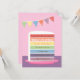 Tenha uma celebração colorida do aniversário começar com este convite de aniversário à moda, elegante e na moda. Características que de design uma fatia alta de bolo do arco-íris com cada camada como o espaço para a personalização do partido detalha. As bandeiras coloridas da estamenha estão pendurando no fundo com padrões diferentes como círculos, diagonais e linhas. Bolinhas cor-de-rosa para o fundo. Design feminino e doce que é grande para meninas e adultos do aniversário!