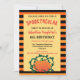 Um convite de aniversário temático do Dia das Bruxas que caracteriza listras pretas e alaranjadas com uma grande abóbora. Uso do ========DESIGN TIP========= o botão da PERSONALIZAÇÃO resize, mudar, ou adicionar ao texto neste convite.